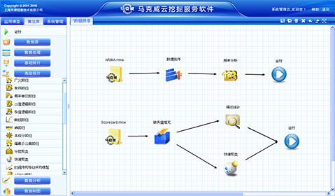 馬克威云挖掘軟件是數(shù)據(jù)分析軟件中以分布式架構(gòu)的大型統(tǒng)計(jì)分析和數(shù)據(jù)挖掘軟件,具有完全自主知識產(chǎn)權(quán)(備案號2013SR092246)。馬克威云挖掘軟件能夠獲取云端數(shù)據(jù),如: HADOOP平臺、阿里云飛天平臺等,通過數(shù)據(jù)挖掘和統(tǒng)計(jì)分析算法建立概念模型,從海量數(shù)據(jù)中尋找規(guī)律和知識,為決策者提供科學(xué)的決策依據(jù)。目前運(yùn)行單張表數(shù)據(jù)量為3.4T,處理速度為36秒左右。