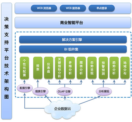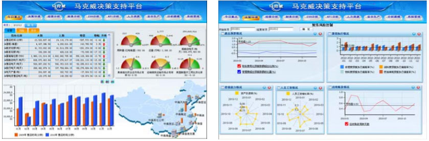 馬克威決策支持平臺(tái)包括:態(tài)勢呈現(xiàn)與比較、指標(biāo)評(píng)估與預(yù)警、趨勢分析和預(yù)測、地域分布呈現(xiàn)、決策模型、多維分析、可視化視圖、自由配置等功能。